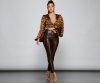 Achieve a chic look for the fall season with this on-trend crop top. It features long dramatic puff sleeves, a deep V-neckline, faux button details, and a cropped fit. The sleek satin fabric has an all-over leopard print for a stylish vibe. Complete the outfit with