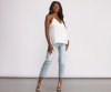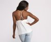 Keep it casual in a trendy cami top. This top features a sleeveless bodice, a v-neckline, spaghetti straps and an open back with a twisted bar strap accent. The top is composed of a lightweight woven fabric that offers a relaxed fit with a slight stretch. Complete your look with a pair of