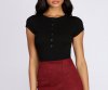 Hey stunner, show off your cute style in this snap detail henley bodysuit! It features short sleeves, a three snap button down detail along with faux snap buttons, and a thong bottom with a dual snap button closure. Bodysuit is composed of a ribbed knit fabric with plenty of stretch and a form hugging fit.