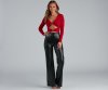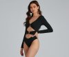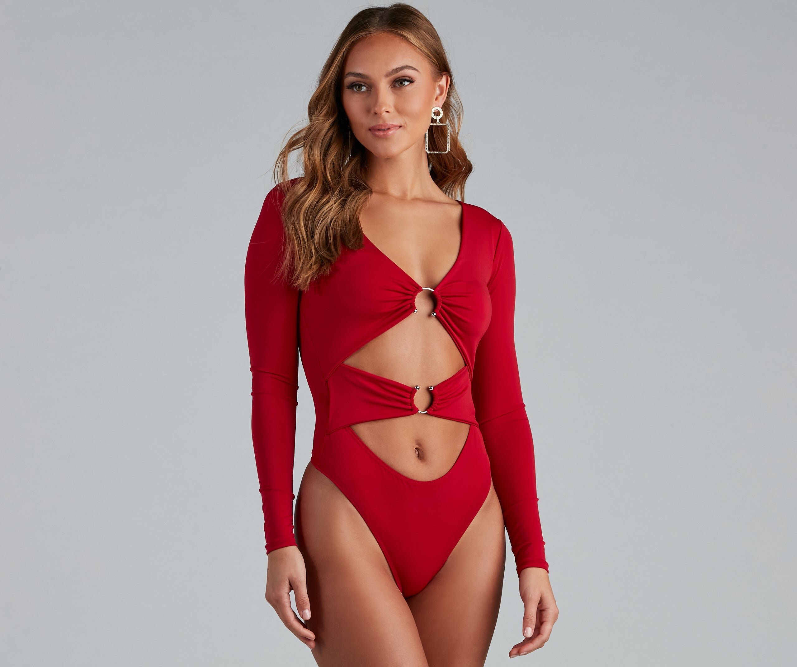 Make this bodysuit the one you can count on to make make a daring impression! The bodysuit features a plunging V-neckline, a double O-ring design, long sleeves, a sexy cutout at the midriff, and a thong bottom with a dual snap-button closure. The bodysuit is composed of a smooth knit fabric that offers a form-hugging fit with a moderate stretch. Complete look with high waist jeans and